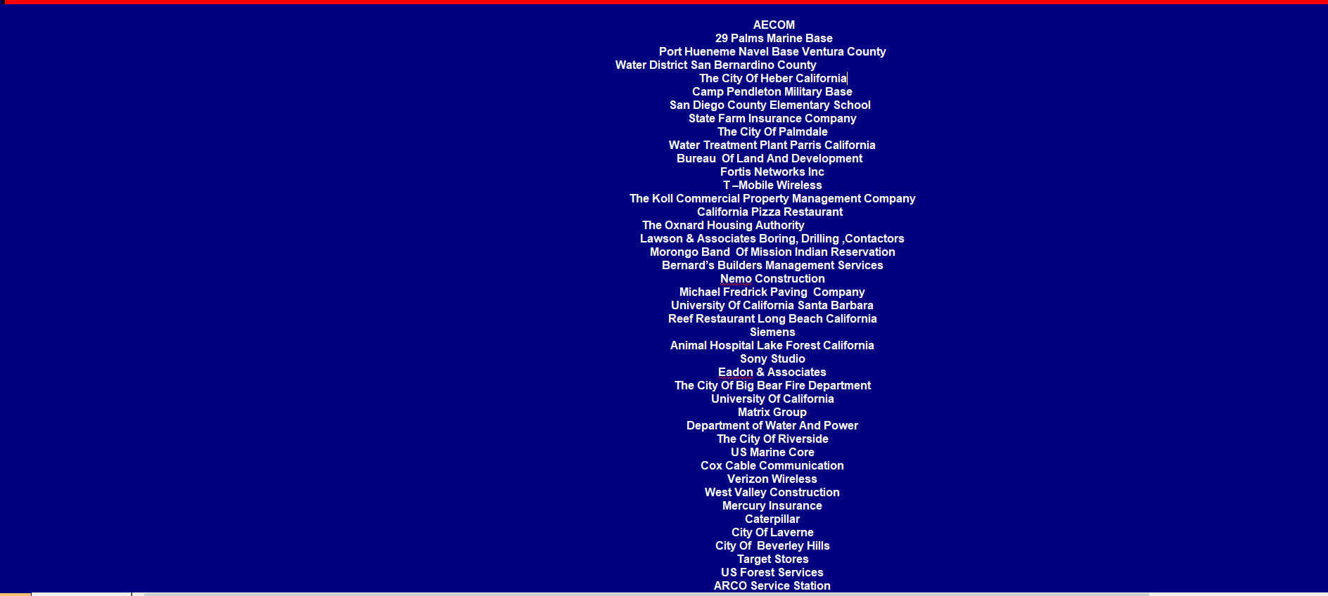 95111 SAN JOSE 90006 LOS ANGELES 93309 BAKERSFIELD 92627 COSTA MESA 43130